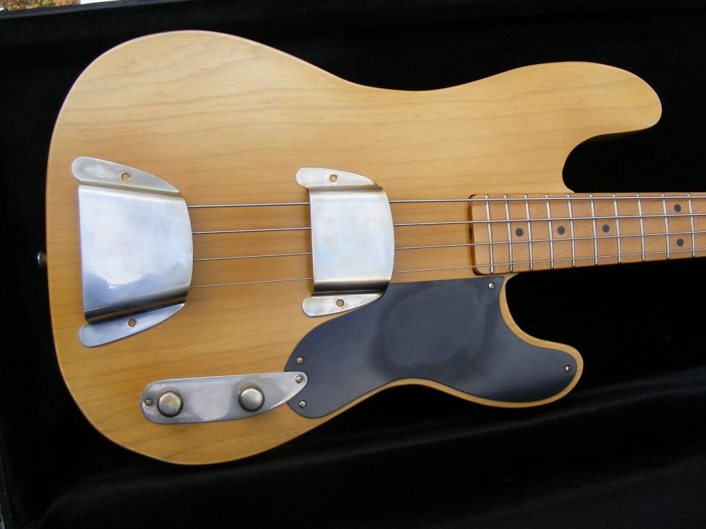 A very special slab cut bass...super lighweight premium swamp ash body in see thru butterscotch blond in our aged but not worn finish....plenty of fading and staining. One piece maple neck in tinted super smooth satin nitro. Gotoh original pattern reverse tuners, lacquered bakelite pickguard, our own reinforced pressed fibreboard saddles, slot head screws. All hardware aged nickel. Bareknuckle staggered pole 52 pickup for added punch. Very comfortable and light at 8 pounds 4. Aged nickel pickup and bridge covers included (unfitted).