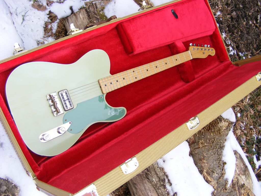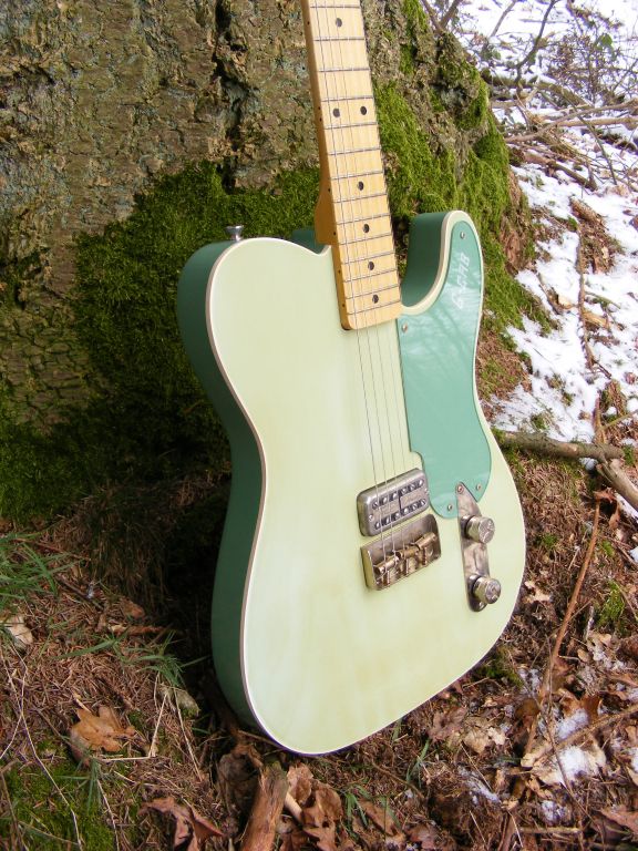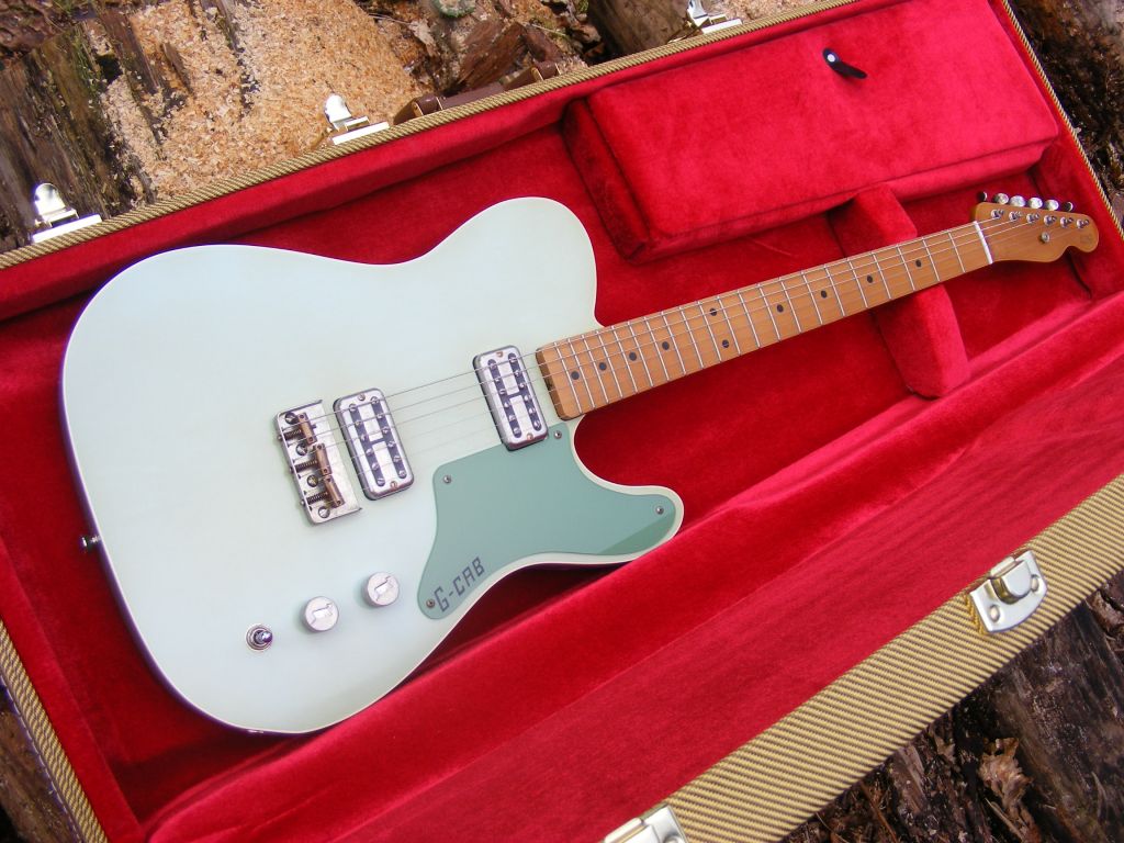 Based on our popular G cab range, this one has a 2 piece premium alder body with top binding, finished in nitro cellulose throughout.....2 tone green with light fading and staining. One piece maple neck, slim C profile, 10" radius fretboard and 6105 frets finished in our smooth satin tinted nitro. Our own custom "G-Cab" pickguard. Lightly aged nickel hardware includes short Tele bridge with compensated saddles. Powered by TV Jones classic and classic plus pickups with aged nickel covers. All top electronics complete the build. A true one off in classic 50's colours.
