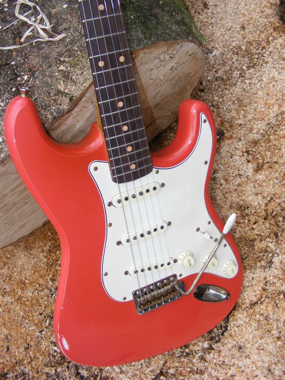 Faded and stained with light wear, Fiesta Red Nitro body. Tinted nitro neck with clay dots. Bareknuckle Irish tour pickups with CTS pots and Sprague cap. Hard case included.