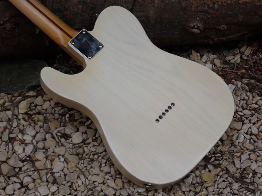 Very lightweight swamp ash body with faded and lightly aged butterscotch blond ntro finish. Age tinted maple neck, Bare Knuckle flat 50's pickups with aged covers and coils. Aged nickel hardware completes the vintage vibe. This one weighs just over 7 pounds.